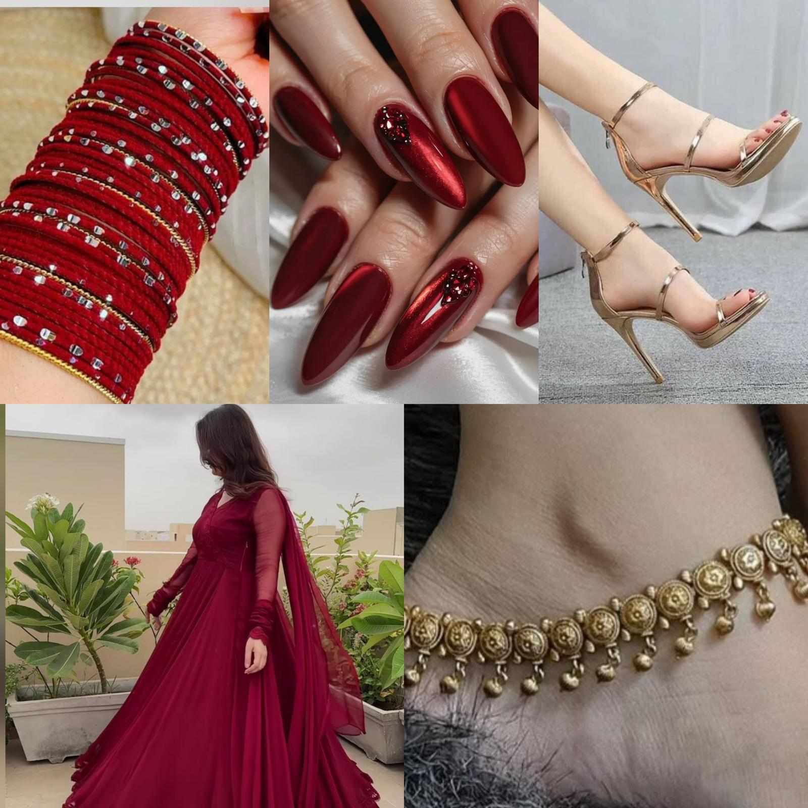 I smooth down the skirt of my **red anarkali suit**. I feel beautiful, dressed up just for him. I applied **soft makeup**, my **long nails** painted a deep maroon. My **long curly hair** is **open**, flowing past my shoulders, and I hear the faint chime of my **payal** and **bangles** with every step I take in my **high heels**.