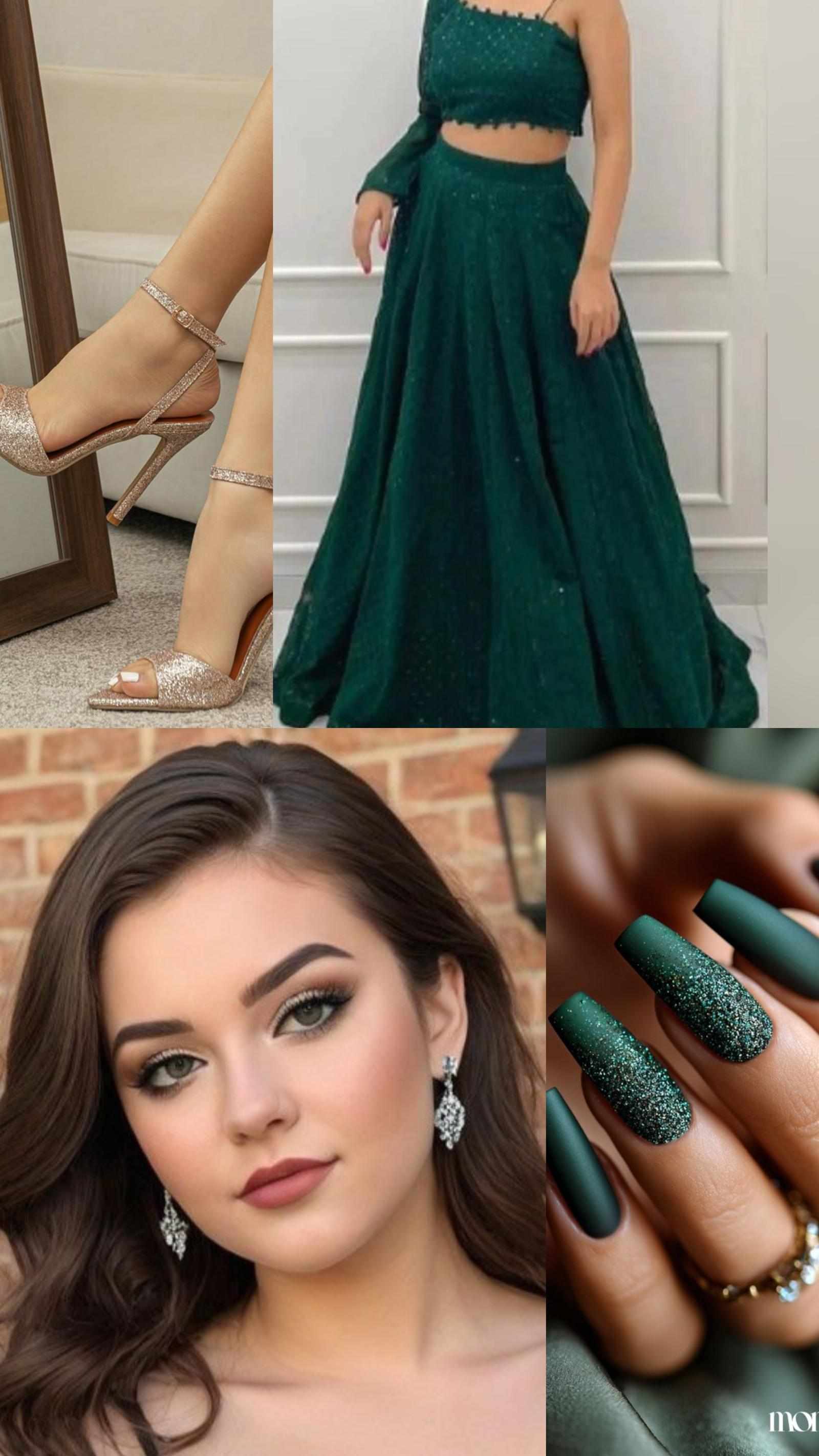 Wearing a **midnight green *lehenga* skirt paired with a matching crop blouse**, backless of course. My **hair half-tied**, **liner sharp, lipstick soft**, **heels five inches tall**, and **confidence ten times more.**