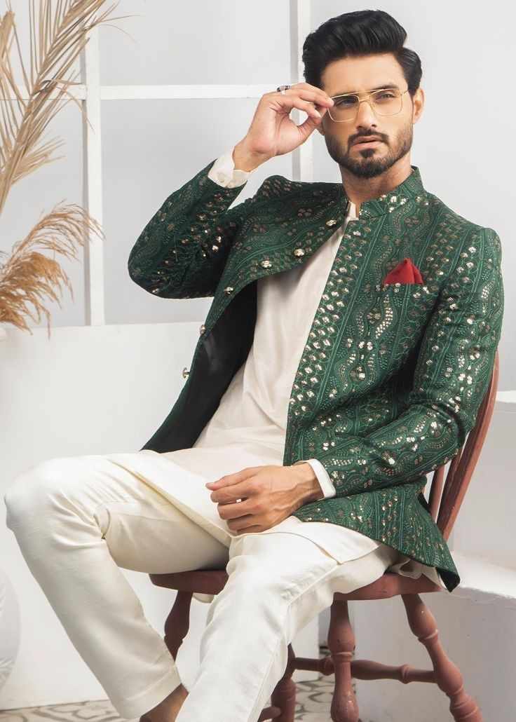 **Rudra** was standing near the entrance, and he looked **damn handsome**. He was wearing a deep green velvet *bandhgala* jacket that matched my outfit perfectly, a detail I knew he’d planned. His **muscular body** filled the suit with effortless power, his **fair color** made the velvet look richer, and his **ocean-blue eyes** were scanning the crowd, looking for me.