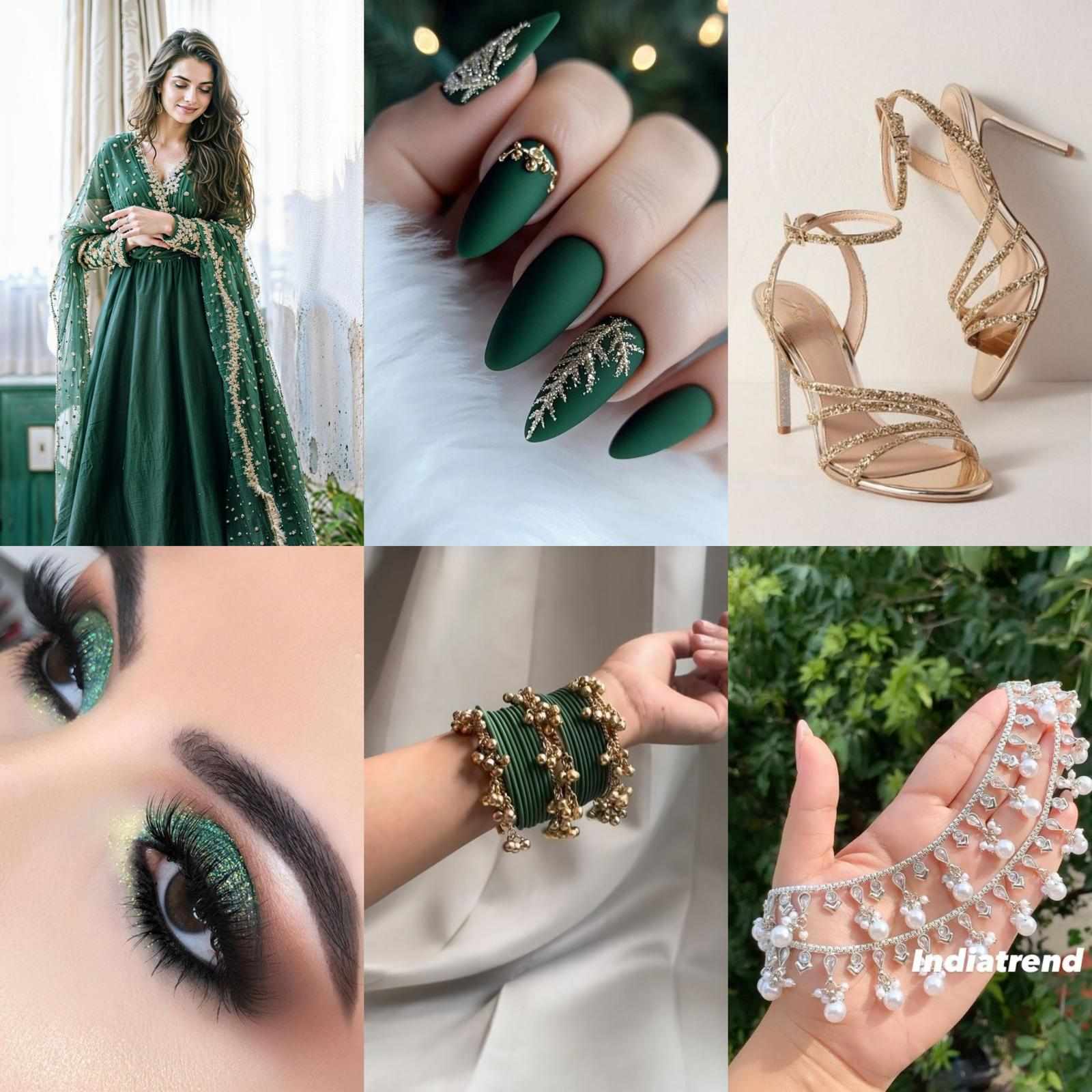 I chose a stunning emerald **green Anarkali suit**. It was tailored perfectly, with a long, flowing skirt. The neckline was modest, but the back was daringly low—a beautiful, **long, deep back** that Rudra had instantly approved of when I showed him a photo. My **long hair** was styled **half-up and tucked** with soft waves, allowing the intricate back detailing of the *Anarkali* to show. My arms were adorned with delicate **bangles**, and I wore the sweetest sound of all: a delicate **Payal** (anklet) that chimed softly with every step. My **makeup** was **soft**, focused on a smoky eye to contrast with the bright green.