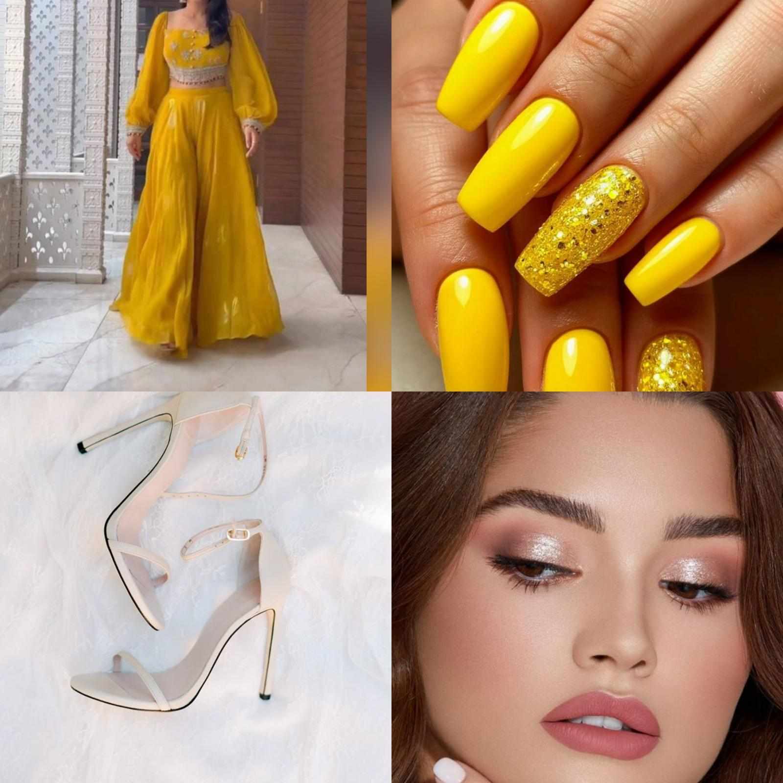 I chose an outfit that was vibrant yet functional, knowing I’d be on my feet. I wore a bright yellow **crop top** paired with flowy, wide **plazo pants**—perfect for navigating the crowds. I completed the look with **high heels** (because Rudra was 6'3" and I refused to look like a doll next to him), my **long hair** was left **open and flowing freely**, and my **long nails** were painted a subtle coral.