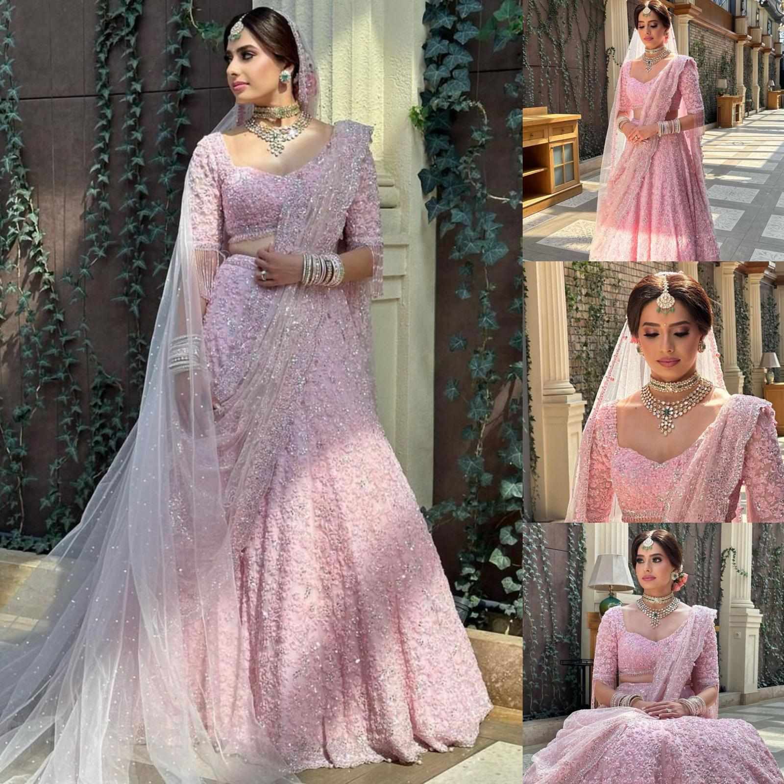 The venue was transformed into a floral dream. It was the day of my **Bridal Shower**, and I felt like I was walking on a cloud of peonies. I was draped in a **beautiful baby pink lehenga** that shimmered under the fairy lights, making my **brown skin** glow with a soft, ethereal radiance. My **long hair** was styled in an intricate braid, woven with fresh jasmine and baby's breath, cascading down my shoulder.