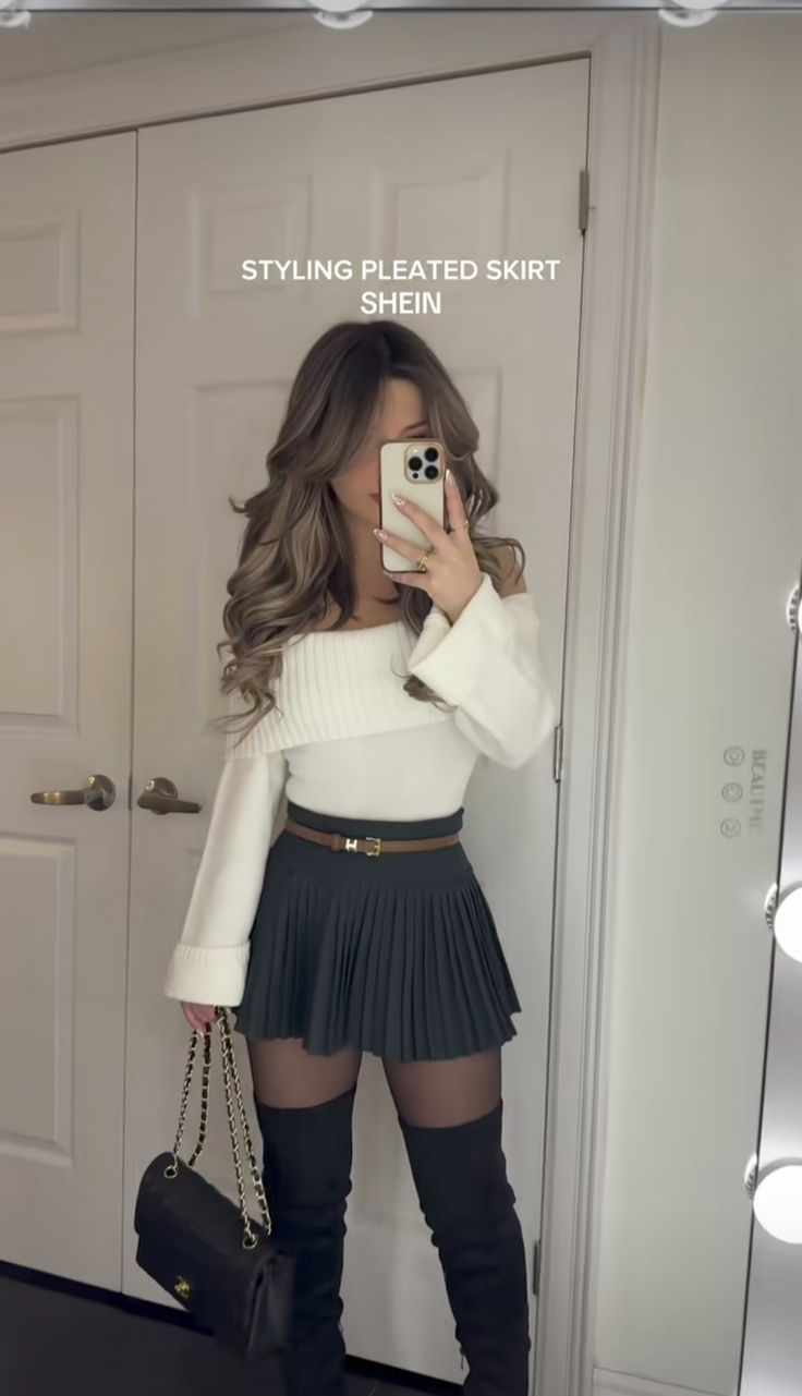 Since it was **New Year’s Eve in Paris**, I wanted to look my best. I chose a chic, cream-colored off-shoulder knitted top that hugged my curves and a plaid mini-skirt that showed off just enough skin. I pulled on my black knee-length heeled boots, feeling every bit like a Parisian model. I kept my makeup soft and natural, but I let my **long curly hair** flow freely over my shoulders. When I caught my reflection, I felt a pair of strong, warm arms wrap around my waist.